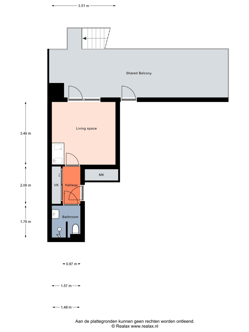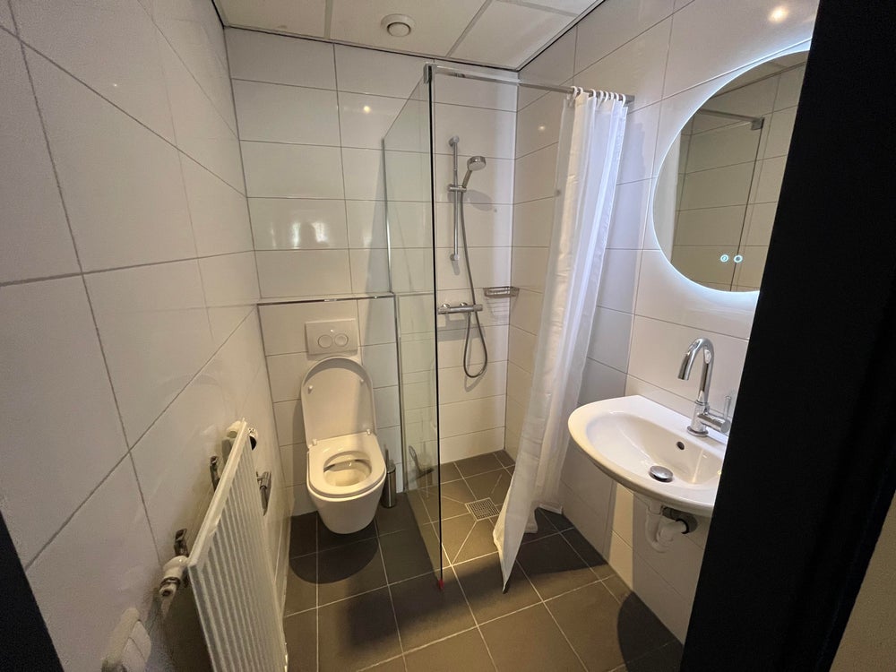 You enter the studio through a hallway with handy built-in wardrobes for extra storage space. On the left is the renovated, heated bathroom (2024), equipped with a shower, toilet, sink and mirror with integrated lighting.
