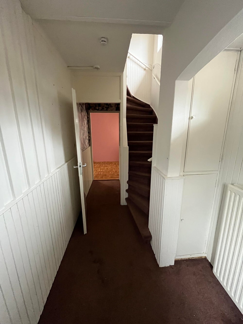 Entree met woonkamer en trapopgang naar de eerste verdieping.