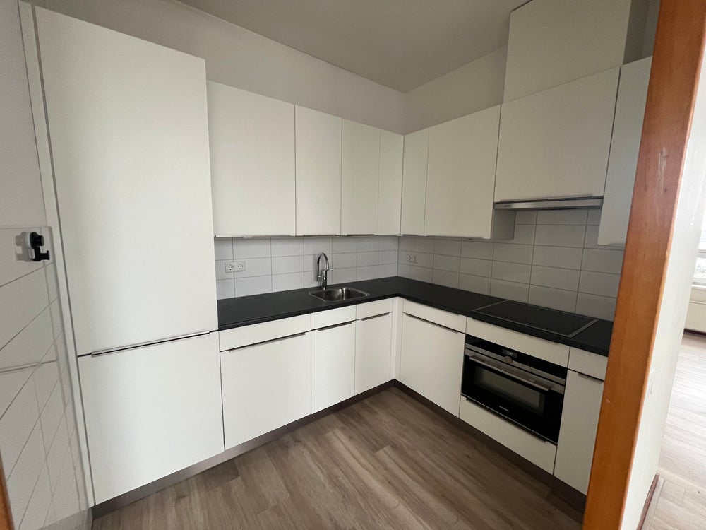 De woonkamer biedt een fijne leefruimte en dankzij de twee grote ramen valt er voldoende daglicht naar binnen. Als verlengstuk van de woonkamer heb je direct toegang tot de loggia. De open keuken is voorzien van een standaard L-vormig keukenblok met koelkast, vriezer, kookplaat, afzuigkap, oven en magnetron.